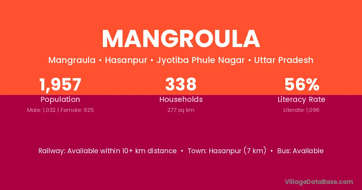 Hasanpur (7 km) is the nearest town to Mangroula village for major economic activities and is located approximately 7 km away.