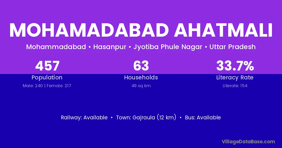 Mohamadabad Ahatmali village has a total population of 457 people, of which 240 are males and 217 are females.