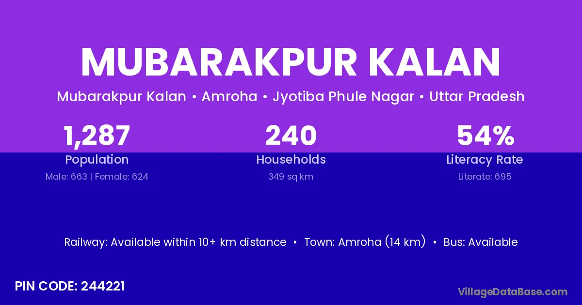 Hasanpur (1 km) is the nearest town to Mubarakpur Kalan village for major economic activities and is located approximately 1 km away.