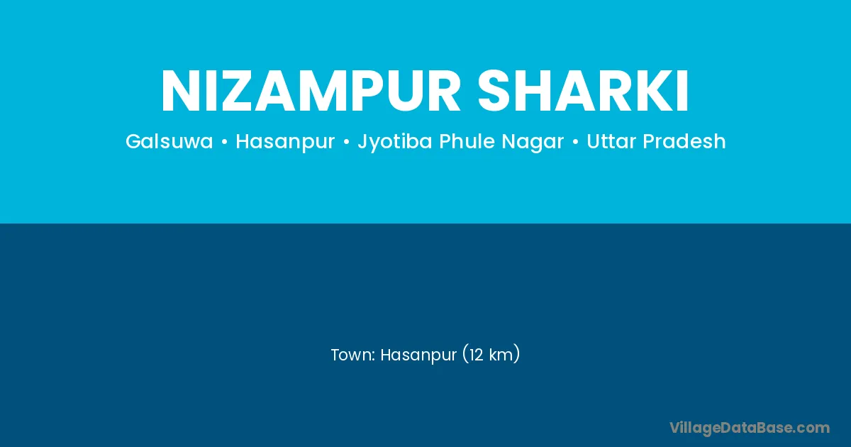 Hasanpur (12 km) is the nearest town to Nizampur Sharki village for major economic activities and is located approximately 12 km away.