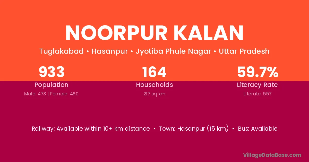 Hasanpur (15 km) is the nearest town to Noorpur Kalan village for major economic activities and is located approximately 15 km away.