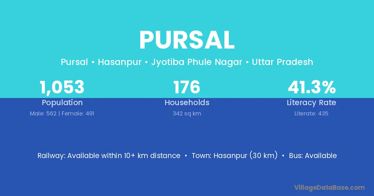 Hasanpur (30 km) is the nearest town to Pursal village for major economic activities and is located approximately 30 km away.