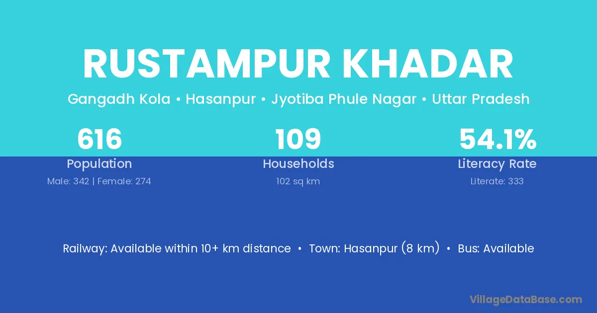 Hasanpur (8 km) is the nearest town to Rustampur Khadar village for major economic activities and is located approximately 8 km away.