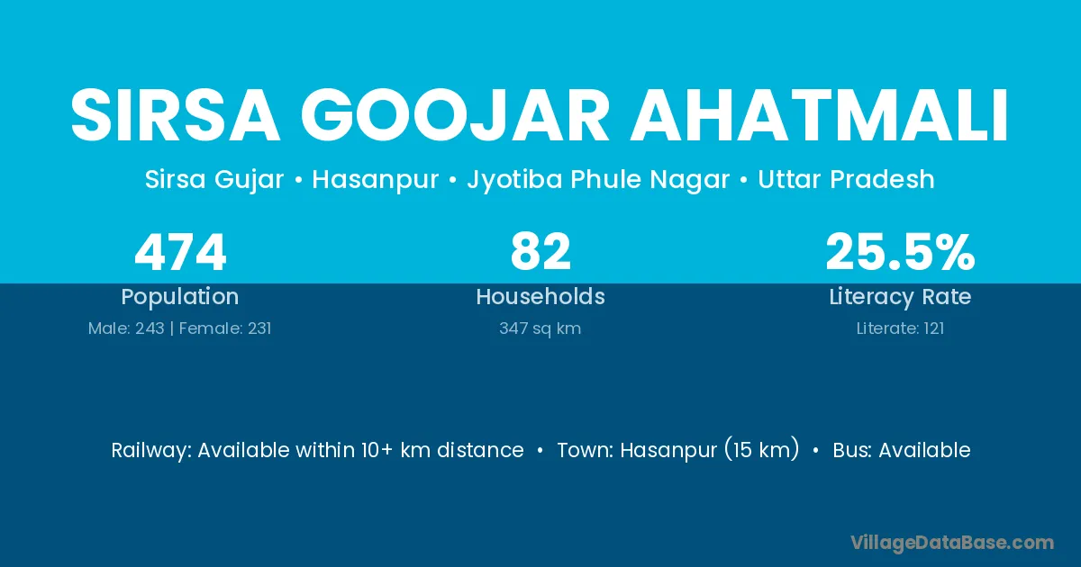 Sirsa Goojar Ahatmali village has a total population of 474 people, of which 243 are males and 231 are females.