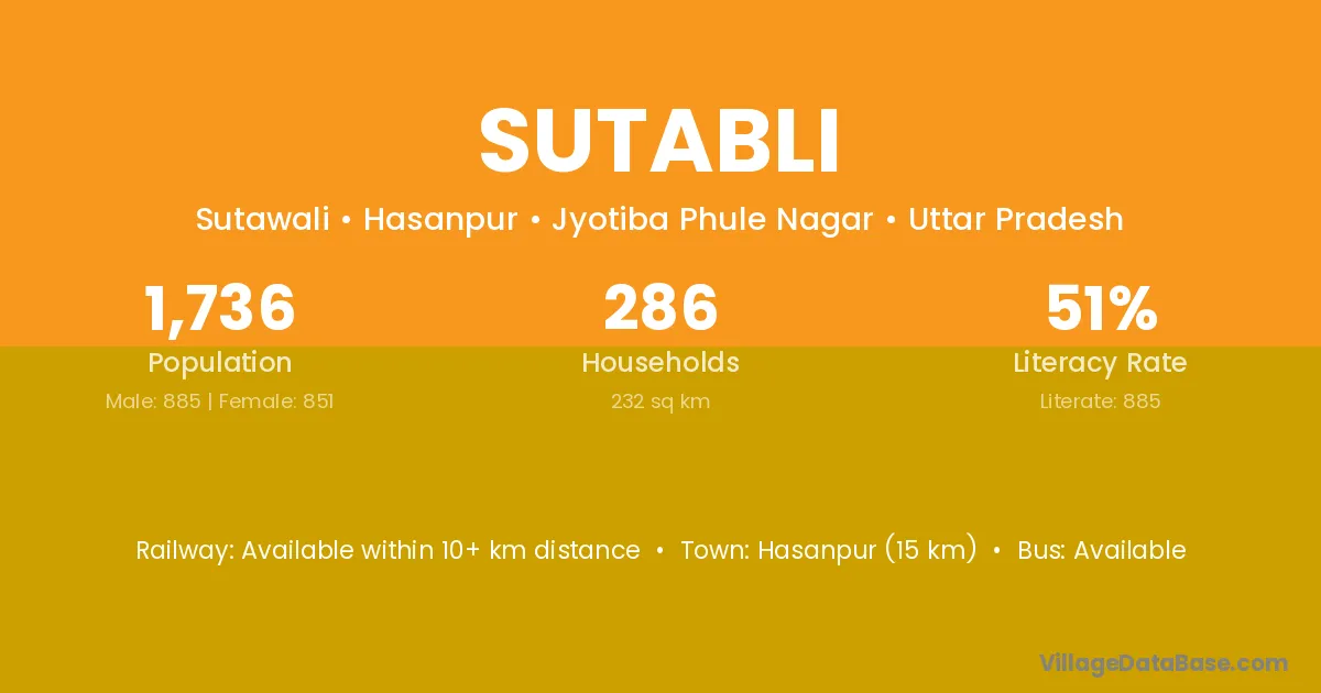 Hasanpur (15 km) is the nearest town to Sutabli village for major economic activities and is located approximately 15 km away.