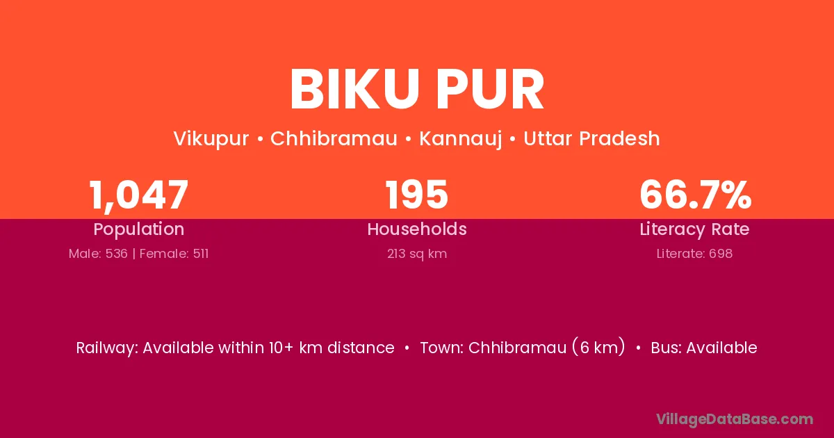 Chhibramau (6 km) is the nearest town to Biku Pur village for major economic activities and is located approximately 6 km away.