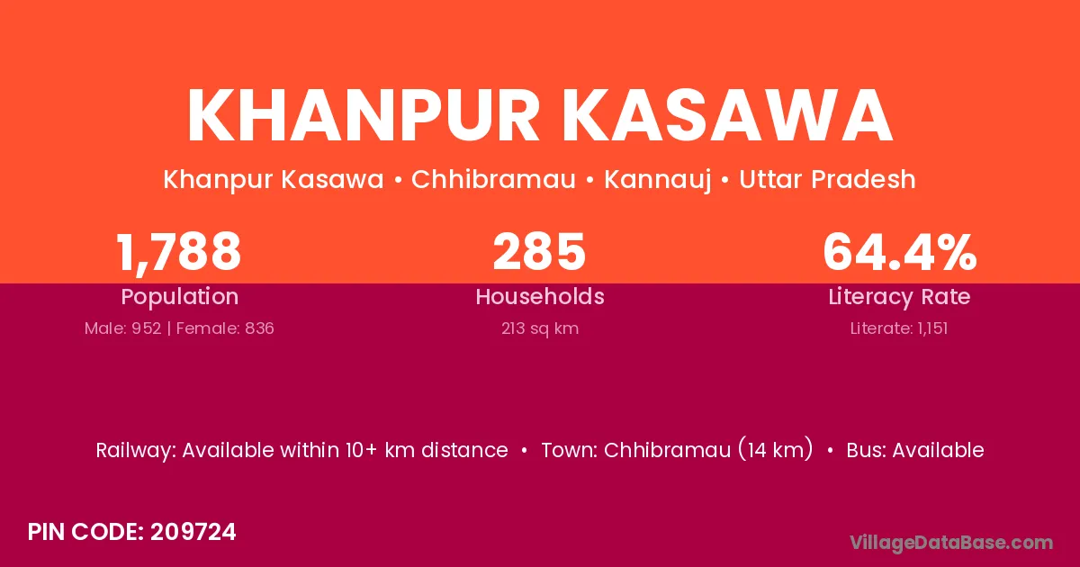 Chhibramau (14 km) is the nearest town to Khanpur Kasawa village for major economic activities and is located approximately 14 km away.