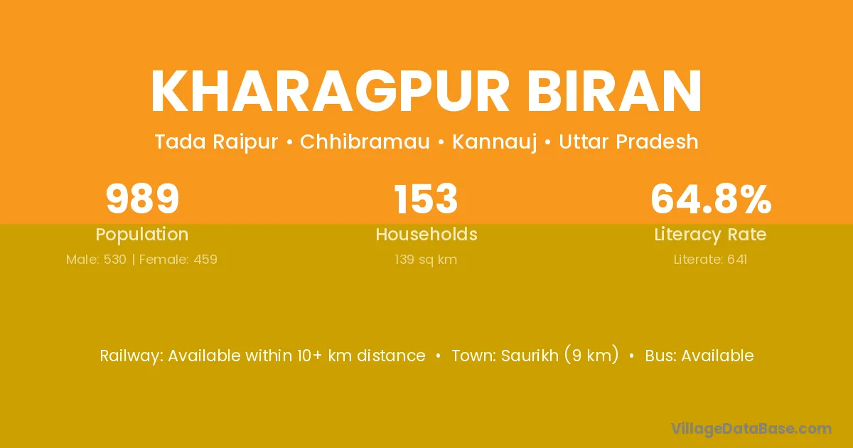 Kharagpur Biran village has a total population of 989 people, of which 530 are males and 459 are females.