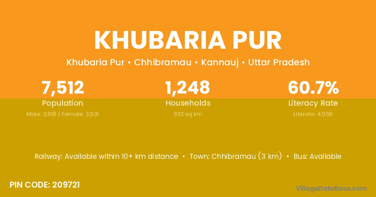 Chhibramau (3 km) is the nearest town to Khubaria Pur village for major economic activities and is located approximately 3 km away.