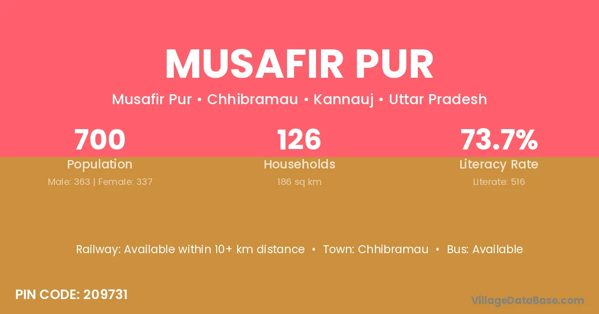 Musafir Pur village has a total population of 700 people, of which 363 are males and 337 are females.