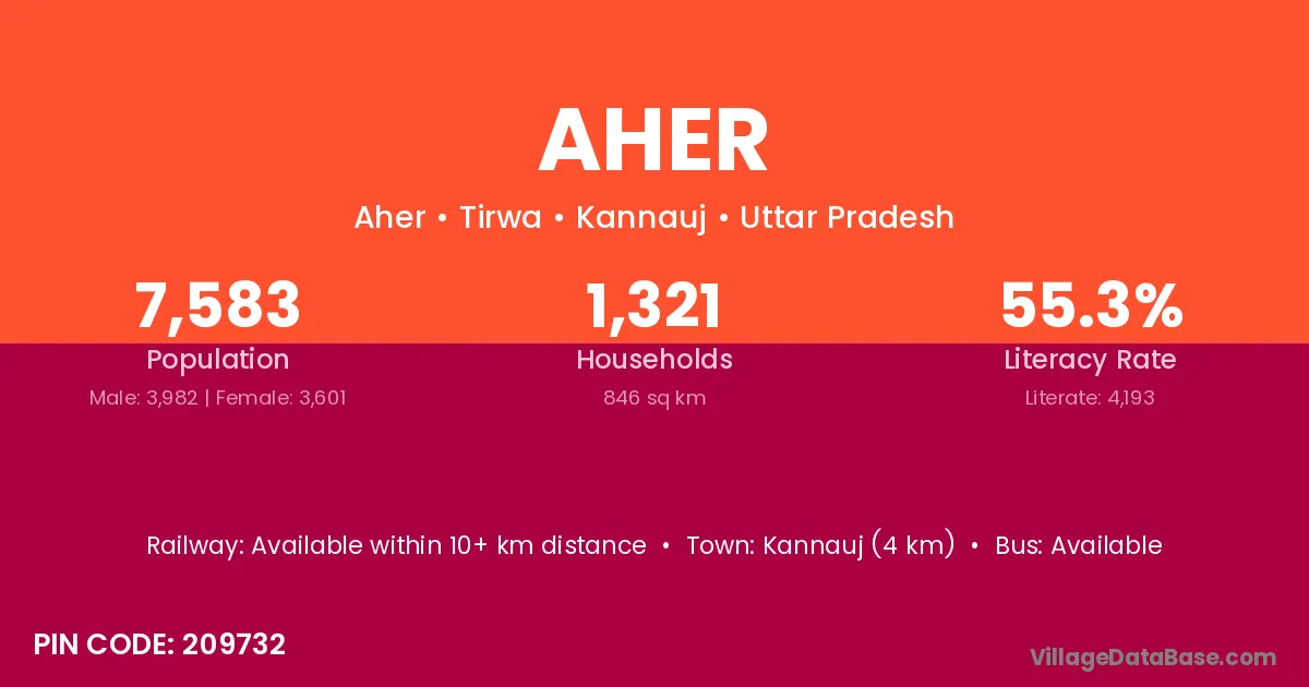 Kannauj (4 km) is the nearest town to Aher village for major economic activities and is located approximately 4 km away.