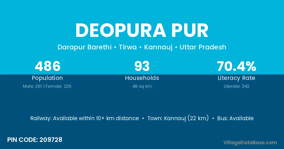 Kannauj (22 km) is the nearest town to Deopura Pur village for major economic activities and is located approximately 22 km away.