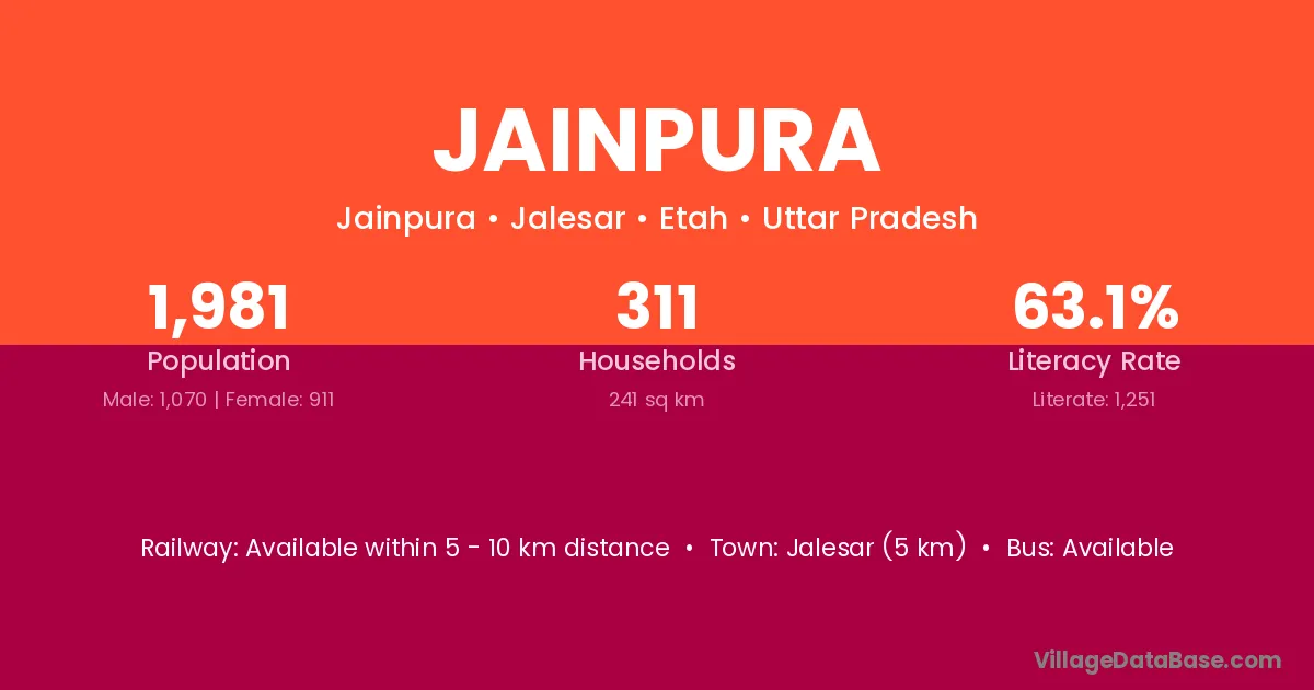 Kannauj (15 km) is the nearest town to Jainpura village for major economic activities and is located approximately 15 km away.