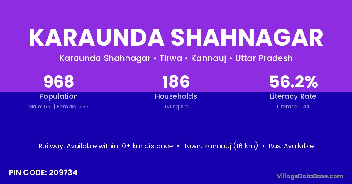 Kannauj (16 km) is the nearest town to Karaunda Shahnagar village for major economic activities and is located approximately 16 km away.