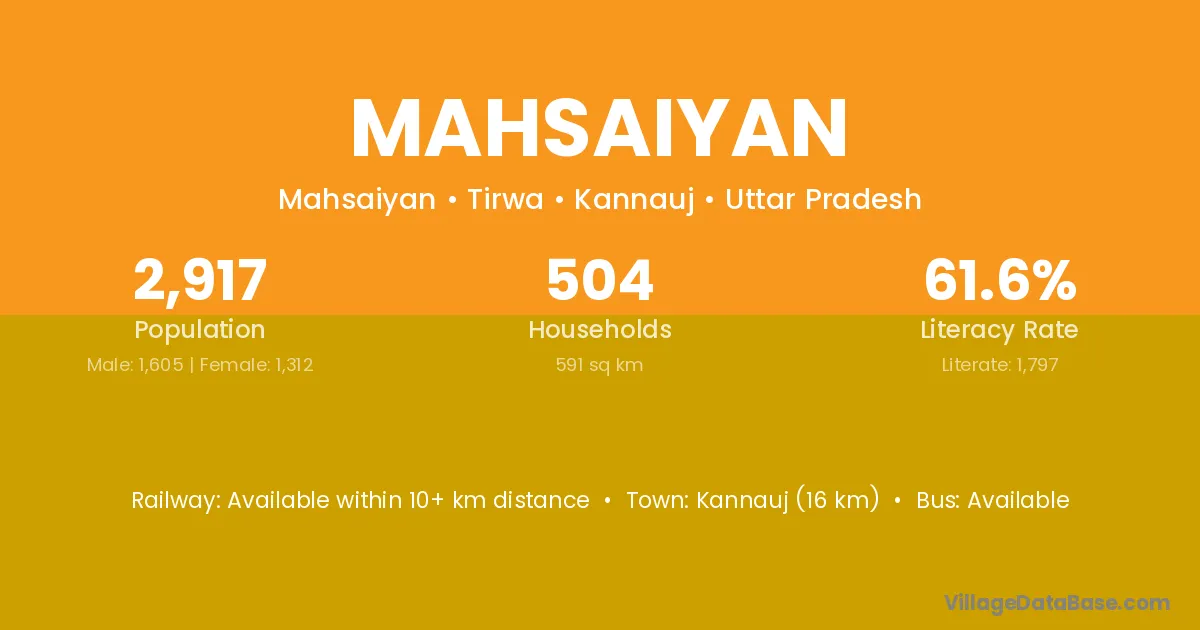 Kannauj (16 km) is the nearest town to Mahsaiyan village for major economic activities and is located approximately 16 km away.