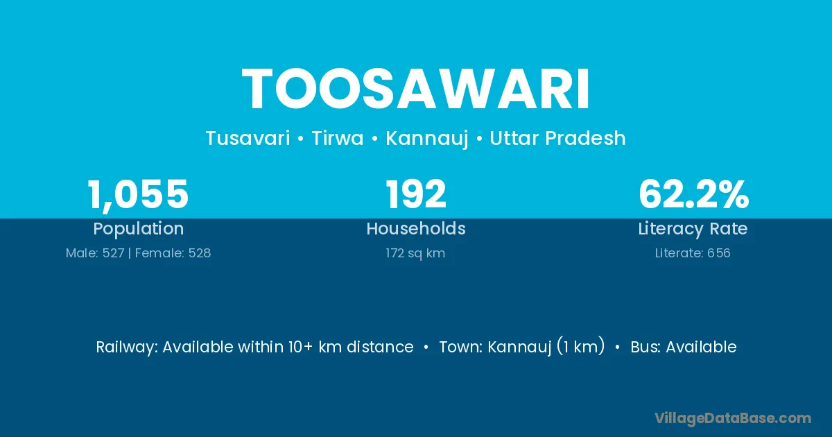 Kannauj (1 km) is the nearest town to Toosawari village for major economic activities and is located approximately 1 km away.