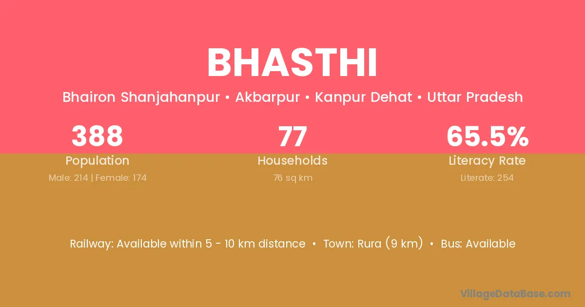 Rura (9 km) is the nearest town to Bhasthi village for major economic activities and is located approximately 9 km away.