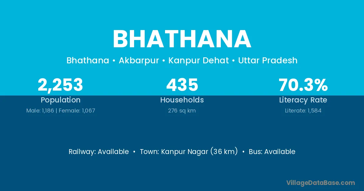 Kanpur Nagar (36 km) is the nearest town to Bhathana village for major economic activities and is located approximately 36 km away.
