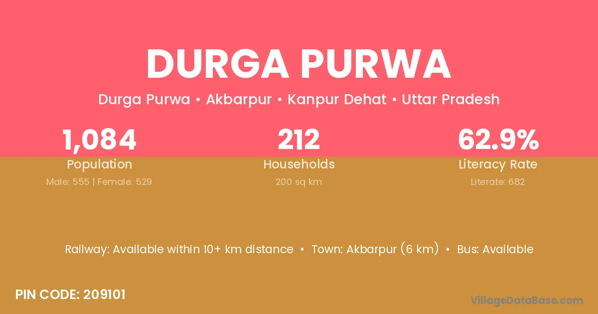 Akbarpur (6 km) is the nearest town to Durga Purwa village for major economic activities and is located approximately 6 km away.