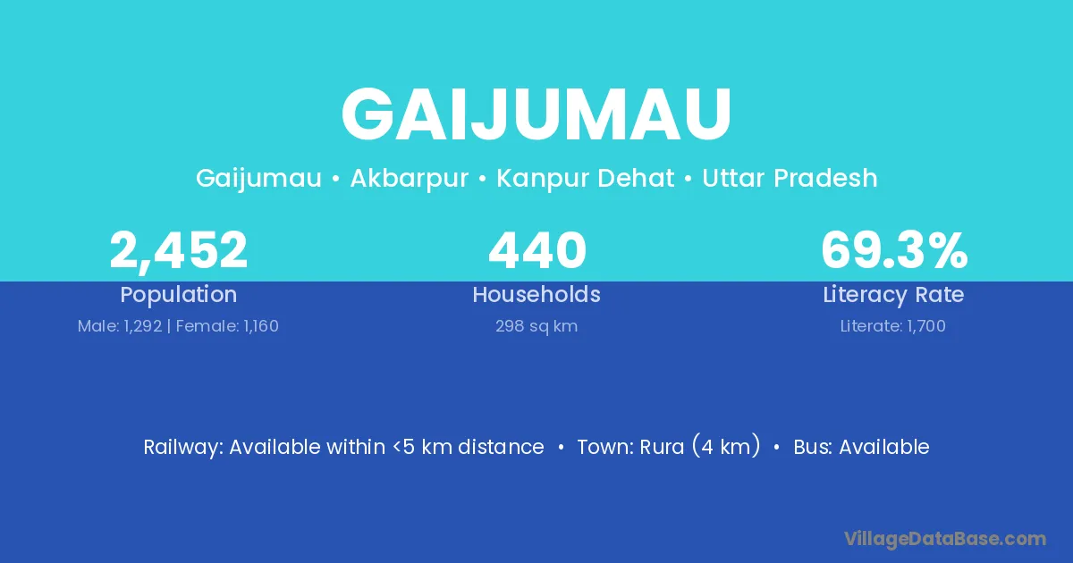 Gaijumau village has a total population of 2,452 people, of which 1,292 are males and 1,160 are females.