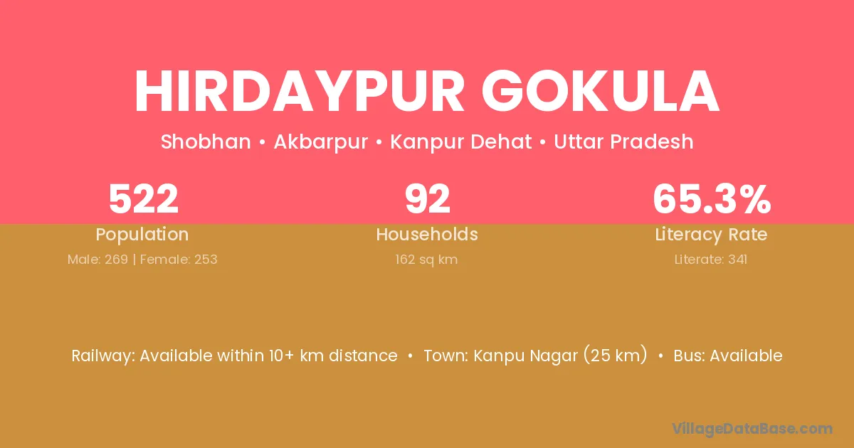 Kanpu Nagar (25 km) is the nearest town to Hirdaypur Gokula village for major economic activities and is located approximately 25 km away.