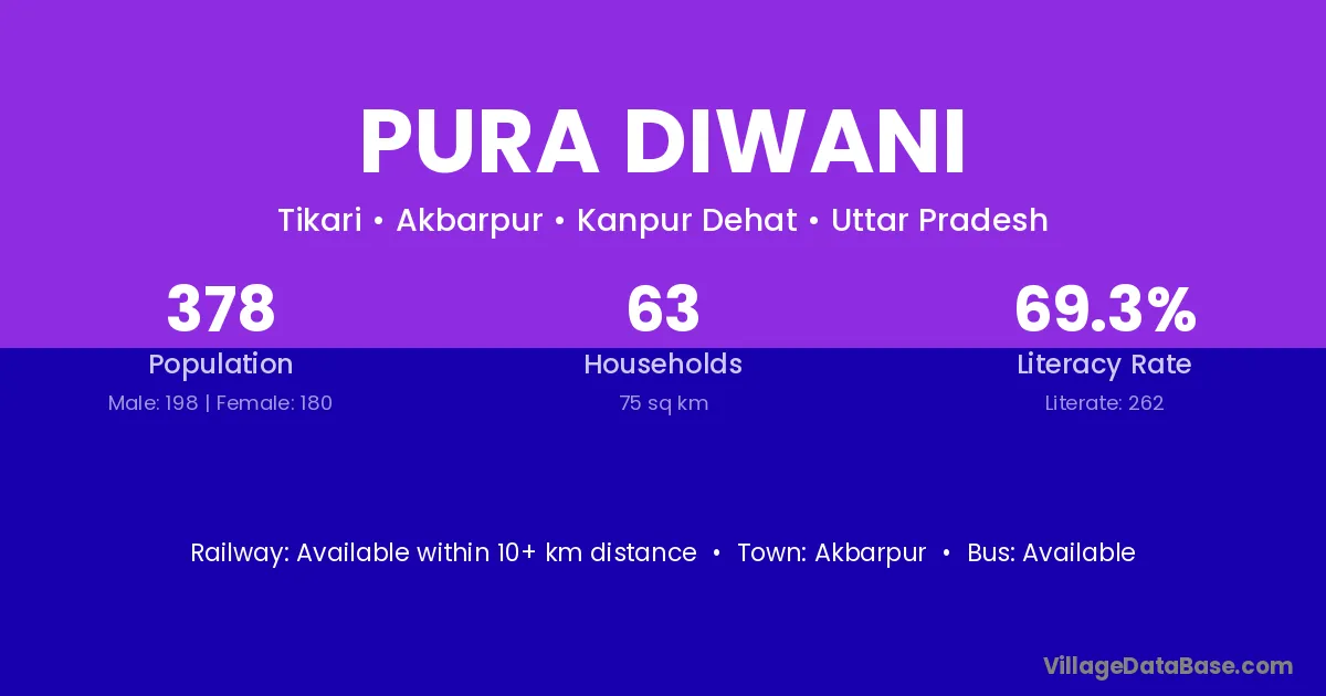 Pura Diwani village has a total population of 378 people, of which 198 are males and 180 are females.