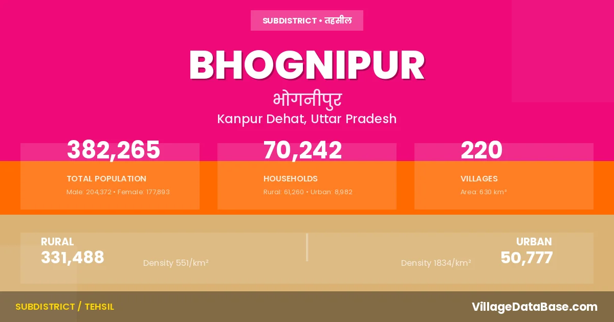 According to the 2011 census The total area of Bhognipur Tehsil is 630 km², with a population of 382265 people. The population density is 607 inhabitants per square kilometre, and there are approximately 70242 houses in the sub district.