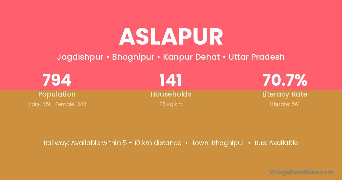 Aslapur village has a total population of 794 people, of which 451 are males and 343 are females.