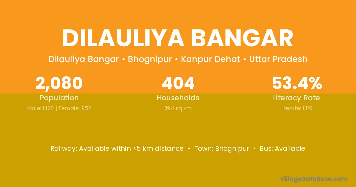 Dilauliya Bangar village has a total population of 2,080 people, of which 1,128 are males and 952 are females.