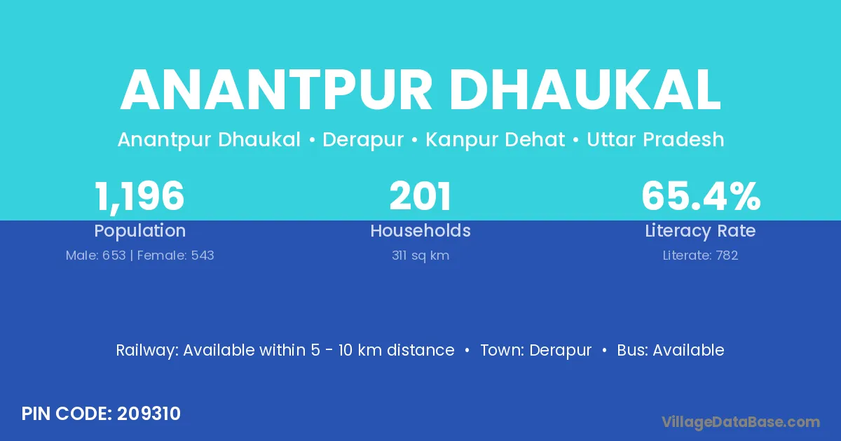 Anantpur Dhaukal village has a total population of 1,196 people, of which 653 are males and 543 are females.