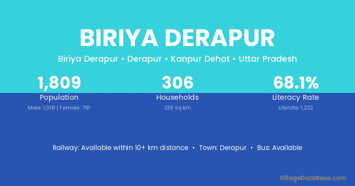 Biriya Derapur village has a total population of 1,809 people, of which 1,018 are males and 791 are females.