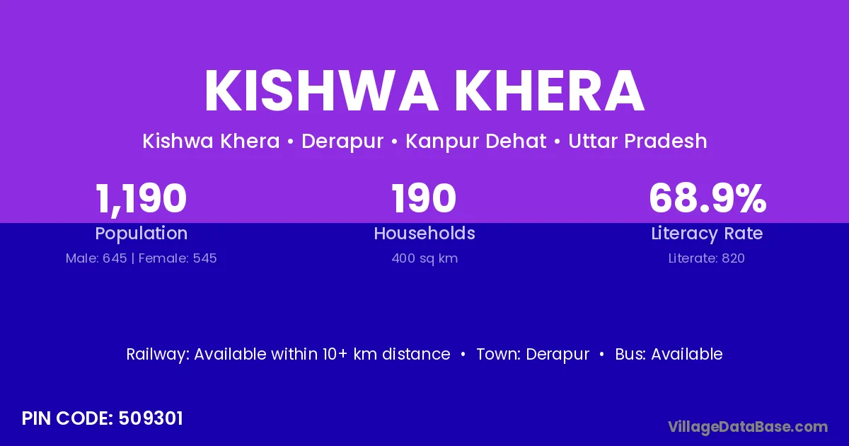 Kishwa Khera village has a total population of 1,190 people, of which 645 are males and 545 are females.