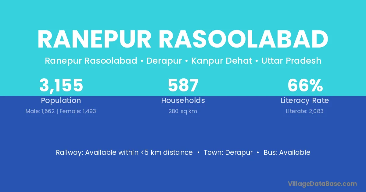 Ranepur Rasoolabad village has a total population of 3,155 people, of which 1,662 are males and 1,493 are females.