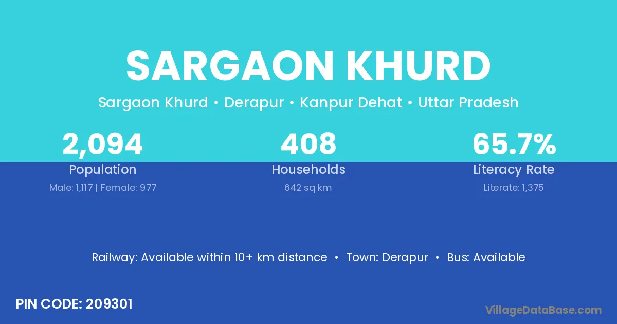 Sargaon Khurd village has a total population of 2,094 people, of which 1,117 are males and 977 are females.