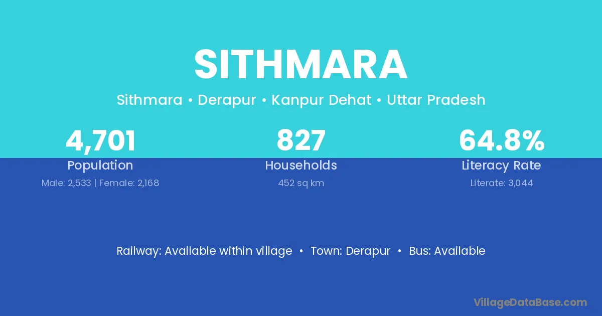 Sithmara village has a total population of 4,701 people, of which 2,533 are males and 2,168 are females.