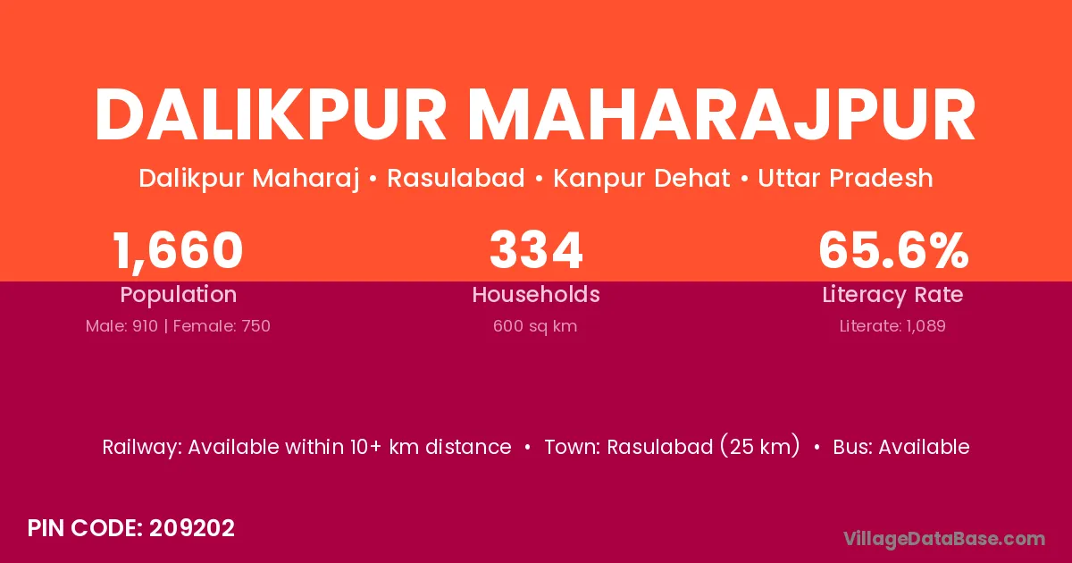 Rasulabad (25 km) is the nearest town to Dalikpur Maharajpur village for major economic activities and is located approximately 25 km away.