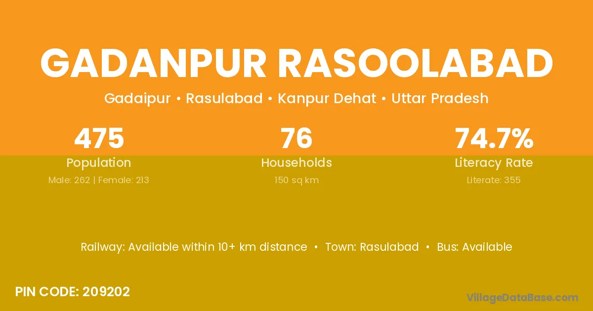 Gadanpur Rasoolabad village has a total population of 475 people, of which 262 are males and 213 are females.