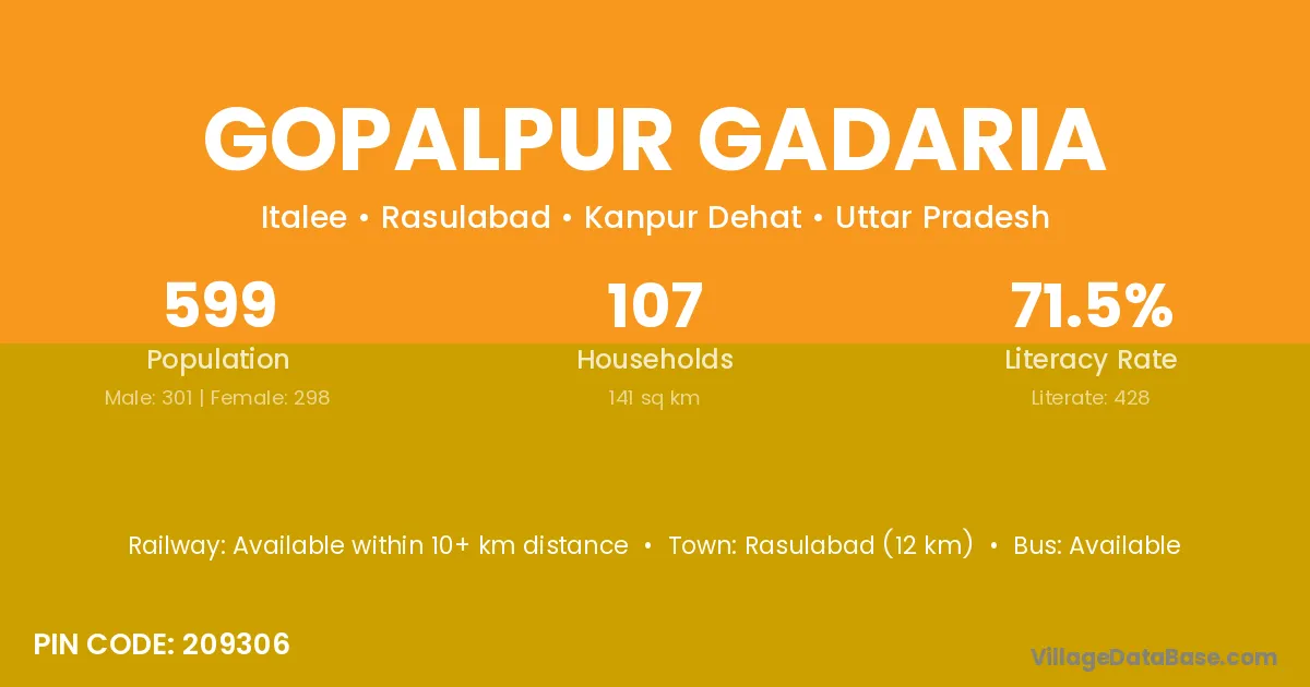 Rasulabad (12 km) is the nearest town to Gopalpur Gadaria village for major economic activities and is located approximately 12 km away.