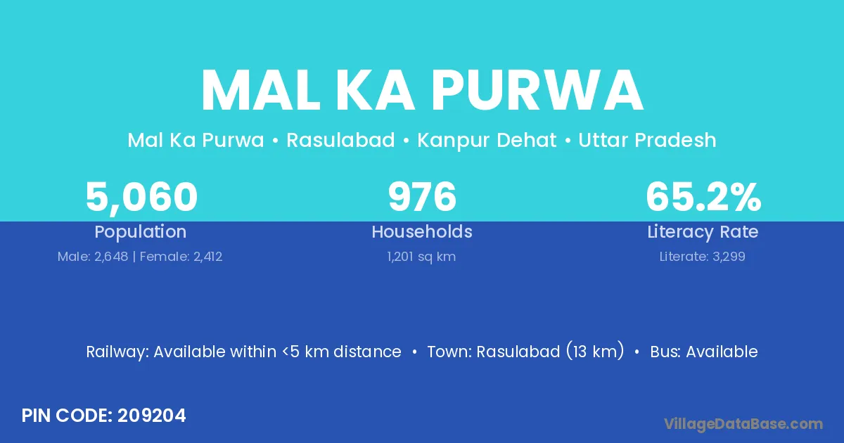 Mal Ka Purwa village has a total population of 5,060 people, of which 2,648 are males and 2,412 are females.