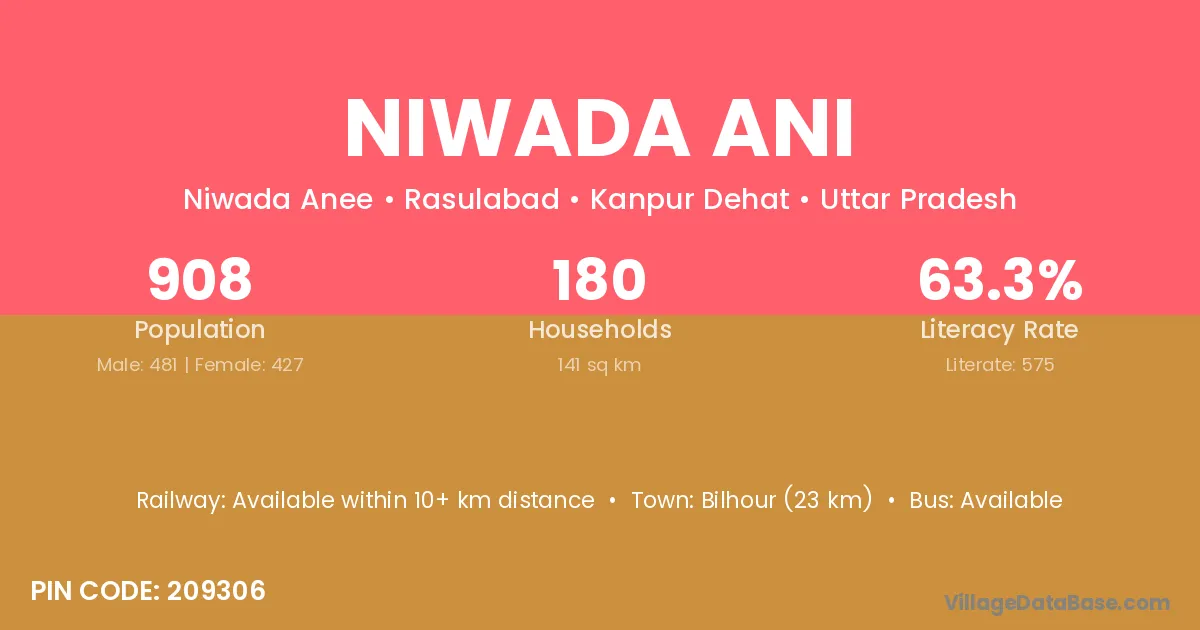 Niwada Ani village has a total population of 908 people, of which 481 are males and 427 are females.