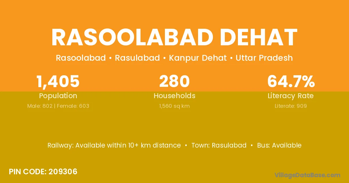 Rasoolabad Dehat village has a total population of 1,405 people, of which 802 are males and 603 are females.