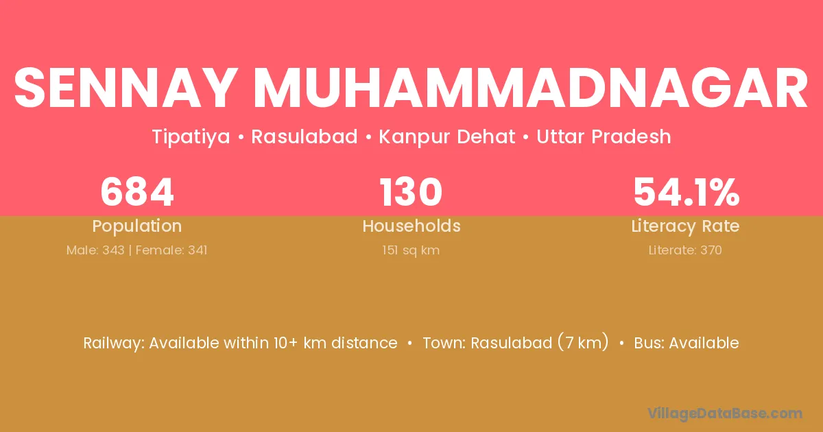 Sennay Muhammadnagar village has a total population of 684 people, of which 343 are males and 341 are females.
