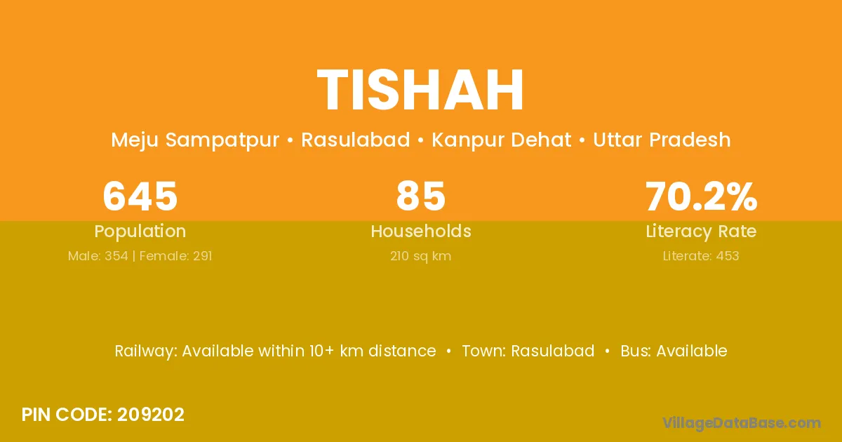Tishah village has a total population of 645 people, of which 354 are males and 291 are females.