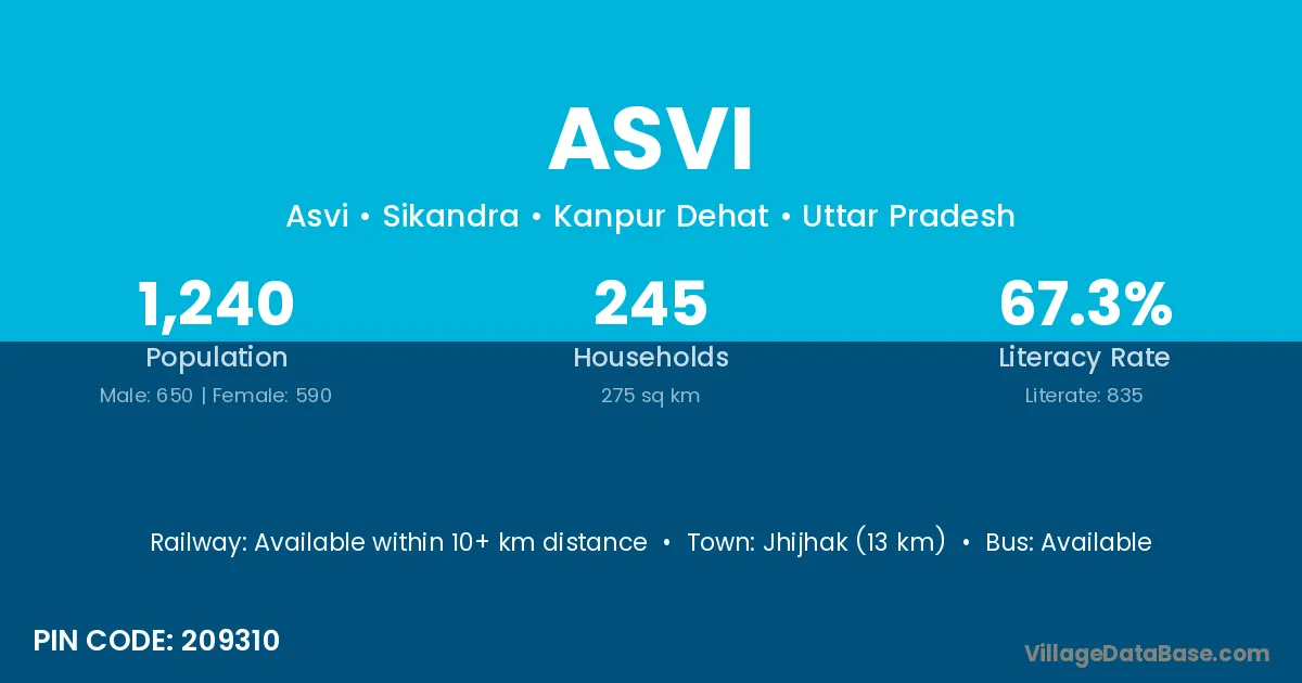 Jhijhak (13 km) is the nearest town to Asvi village for major economic activities and is located approximately 13 km away.