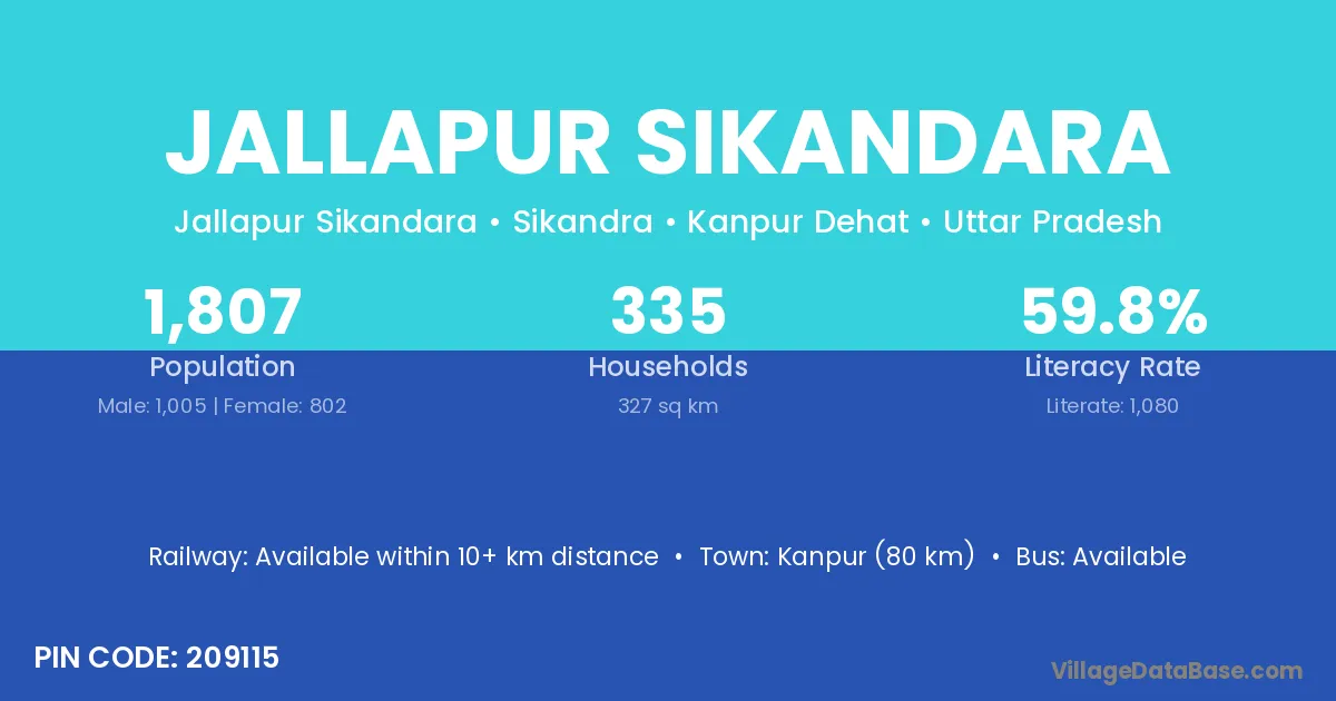 Kanpur (80 km) is the nearest town to Jallapur Sikandara village for major economic activities and is located approximately 80 km away.