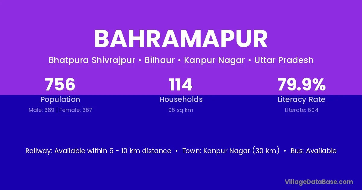 Kanpur Nagar (30 km) is the nearest town to Bahramapur village for major economic activities and is located approximately 30 km away.