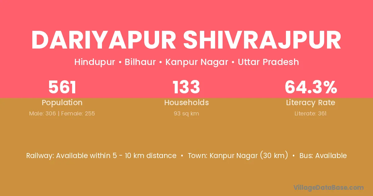 Kanpur Nagar (30 km) is the nearest town to Dariyapur Shivrajpur village for major economic activities and is located approximately 30 km away.