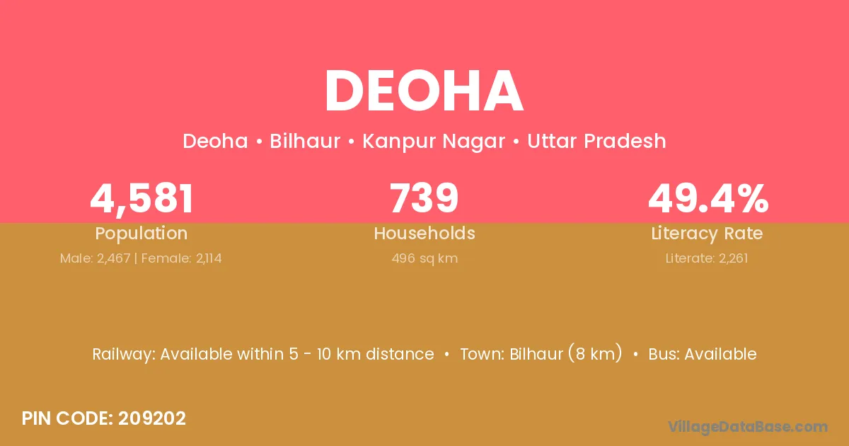 Bilhaur (8 km) is the nearest town to Deoha village for major economic activities and is located approximately 8 km away.