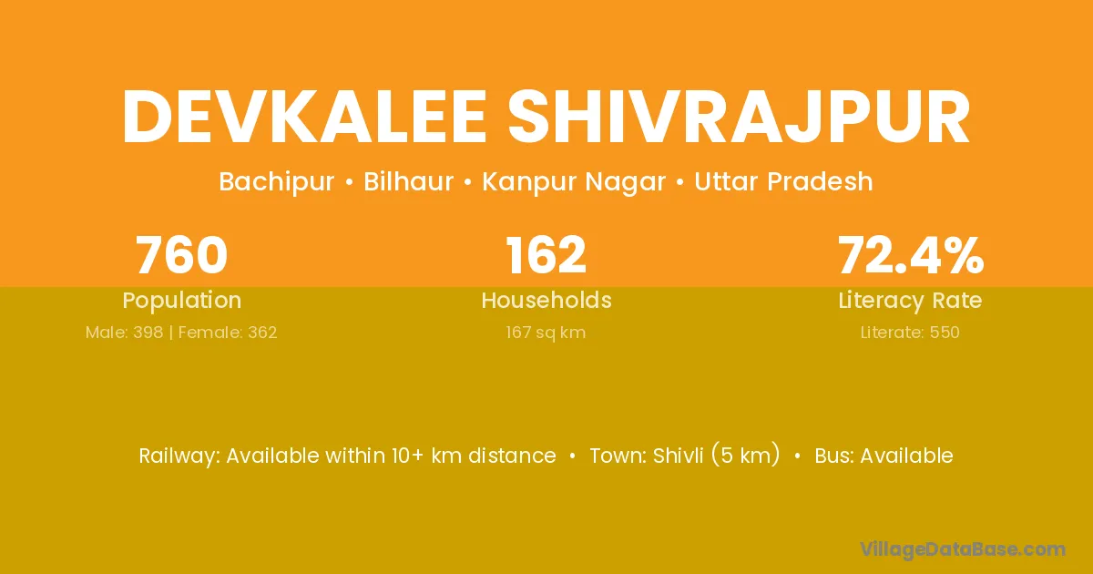 Devkalee Shivrajpur village has a total population of 760 people, of which 398 are males and 362 are females.