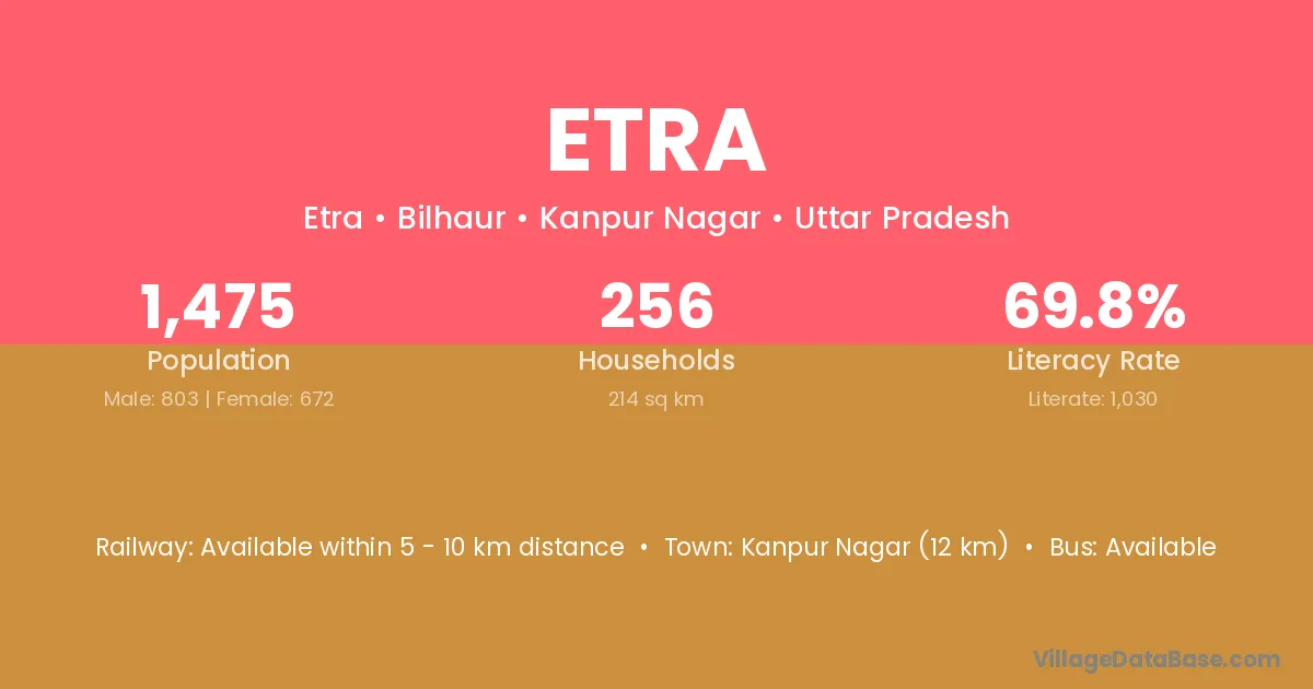Kanpur Nagar (12 km) is the nearest town to Etra village for major economic activities and is located approximately 12 km away.